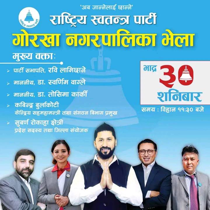 राष्ट्रिय स्वतन्त्र पार्टीको गोरखा नगरपालिकाको भेलालाई सम्बोधन गर्न पार्टीका सभापति रवि लामिछाने र सांसद स्वर्णिम वाग्ले गोरखा आउने भएका छन् ।