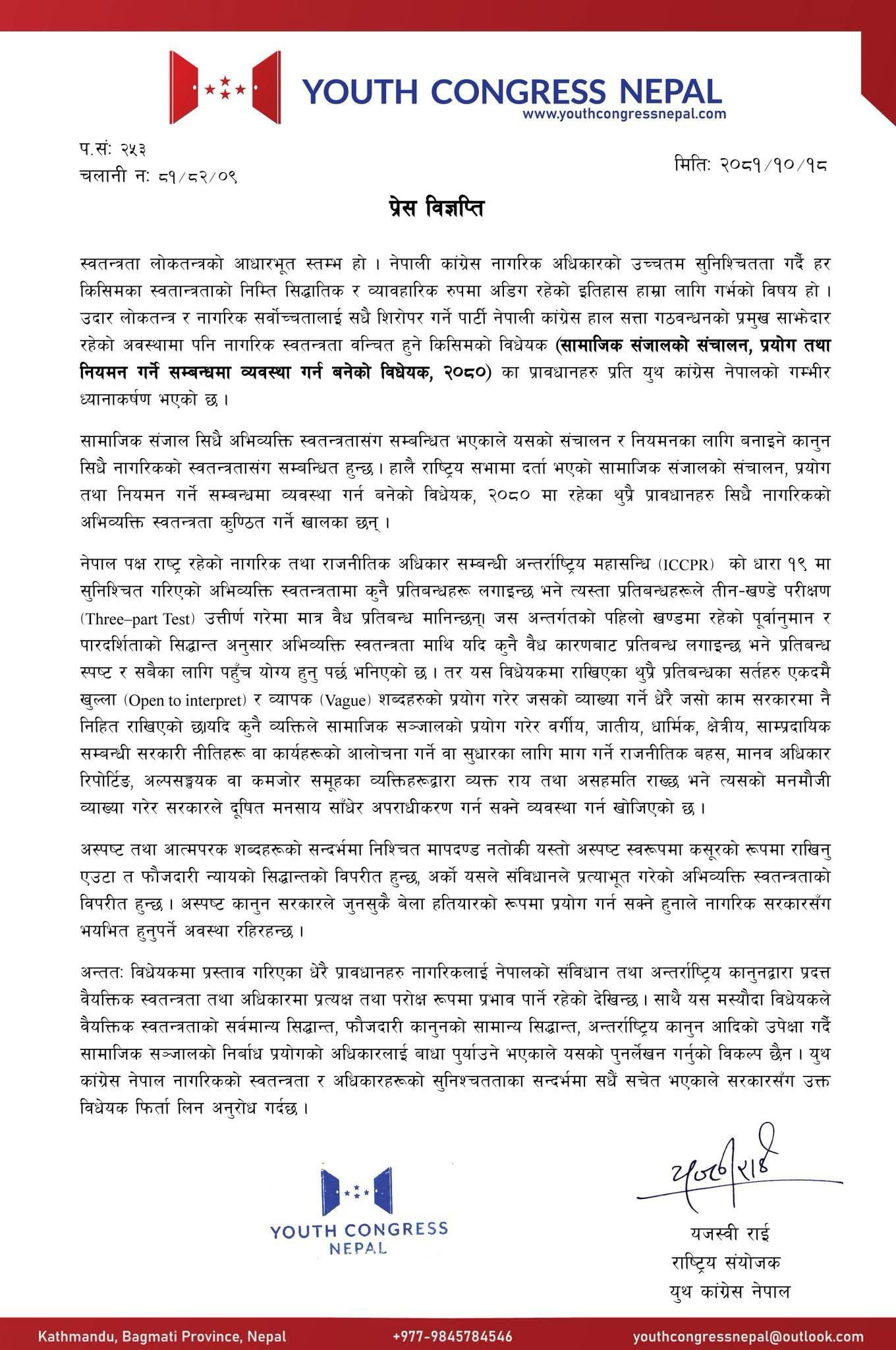 युथ कांग्रेस नेपालले बिहीबार जारी गरेको विज्ञप्तिमा उल्लेख गरिएको छ कि नेपाली कांग्रेस लोकतान्त्रिक मूल्य, मान्यता र नागरिक अधिकारको सुनिश्चितताका लागि अडिग रहेको पार्टी हो। स्वतन्त्रता लोकतन्त्रको आधारभूत स्तम्भ भएको भन्दै संगठनले सामाजिक सञ्जाल सम्बन्धी ल्याइएको विधेयक नागरिक स्वतन्त्रताको प्रतिकूल हुने धारणा राखेको छ।