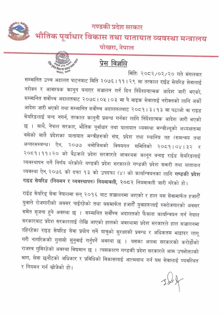 गण्डकी प्रदेश सरकारले जारी गरेको राइड सेयरिङ सम्बन्धी “गण्डकी प्रदेश राइड सेयरिङ (नियमन र व्यवस्थापन) नियमावली, २०८२” को कार्यान्वयन प्रक्रिया एक महिनाका लागि स्थगित गरिएको छ। निर्णय प्रधानमन्त्री तथा मन्त्रिपरिषद्को कार्यालयबाट सार्वजनिक यातायात बन्द फिर्ता गर्न अनुरोधसहित प्राप्त पत्रको आधारमा गरिएको हो।