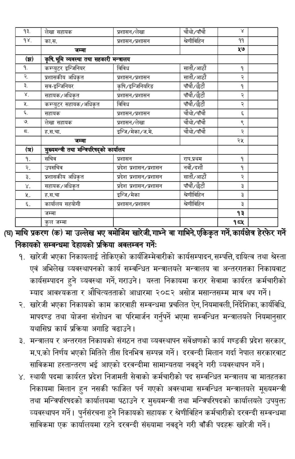 प्रदेशसभा सचिवालयमा १, नीति तथा योजना आयोगमा ३, उद्योग तथा पर्यटन मन्त्रालयमा ९, ऊर्जा, जलस्रोत तथा खानेपानी मन्त्रालयमा १४, भौतिक पूर्वाधारमा ७, वन तथा वातावरणमा ३२, सामाजिक विकासमा २४, स्वास्थ्यमा सबैभन्दा धेरै ५७ र कृषिमा २५ पद खारेज गरिएको छ। मुख्यमन्त्री कार्यालयका विभिन्न तहका १३ पद पनि कटौती गरिएको छ।