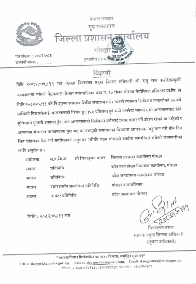 गोरखा । गोरखा मेमोरियल अस्पतालले इशाई धर्मावलम्बीलाई मात्र ५० प्रतिशत छुट दिने सूचना सम्प्रेषण गरेको आरोपपछि जिल्ला प्रशासन कार्यालय गोरखाले अनुगमन समिति गठन गरेको छ।
