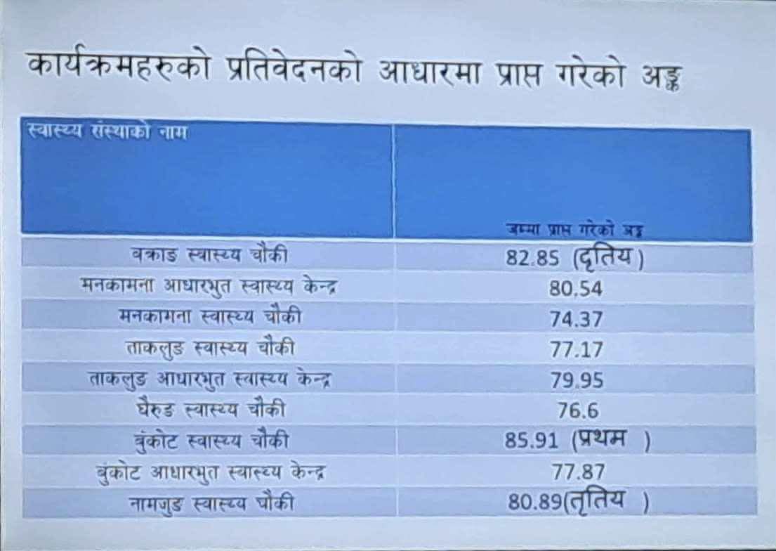 पालिका भित्रका अन्य स्वास्थ्य संस्थामध्ये बक्राङ्ग स्वास्थ्य चौकी ८२.८५ अंकका साथ द्वितीय र नामजुङ्ग स्वास्थ्य चौकी ८०.८९ अंकका साथ तृतीय भएका छन्। त्यस्तै मनकामना आधारभूत स्वास्थ्य केन्द्रले ८०.५४, ताक्लुङ आधारभूत स्वास्थ्य केन्द्रले ७९.९५, बुंकोट आधारभूत स्वास्थ्य केन्द्रले ७७.८७, ताक्लुङ स्वास्थ्य चौकीले ७७.१७, घैरुङ स्वास्थ्य चौकीले ७६.६ र मनकामना स्वास्थ्य चौकीले ७४.३७ अंक प्राप्त गरेको स्वास्थ्य शाखा प्रमुख श्रेष्ठले जानकारी दिएका छन्।